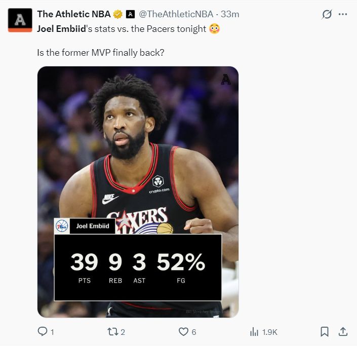 根据美媒BF的统计,恩比德自2024年5月以来终于完成了一场39分及以上的得分,换言之恩比德时隔19个月再度拿到39+的数据,这对于他自身而言算一个里程碑,毕竟恩比德本赛季依旧是带伤鏖战,他的膝盖已经千疮百孔。