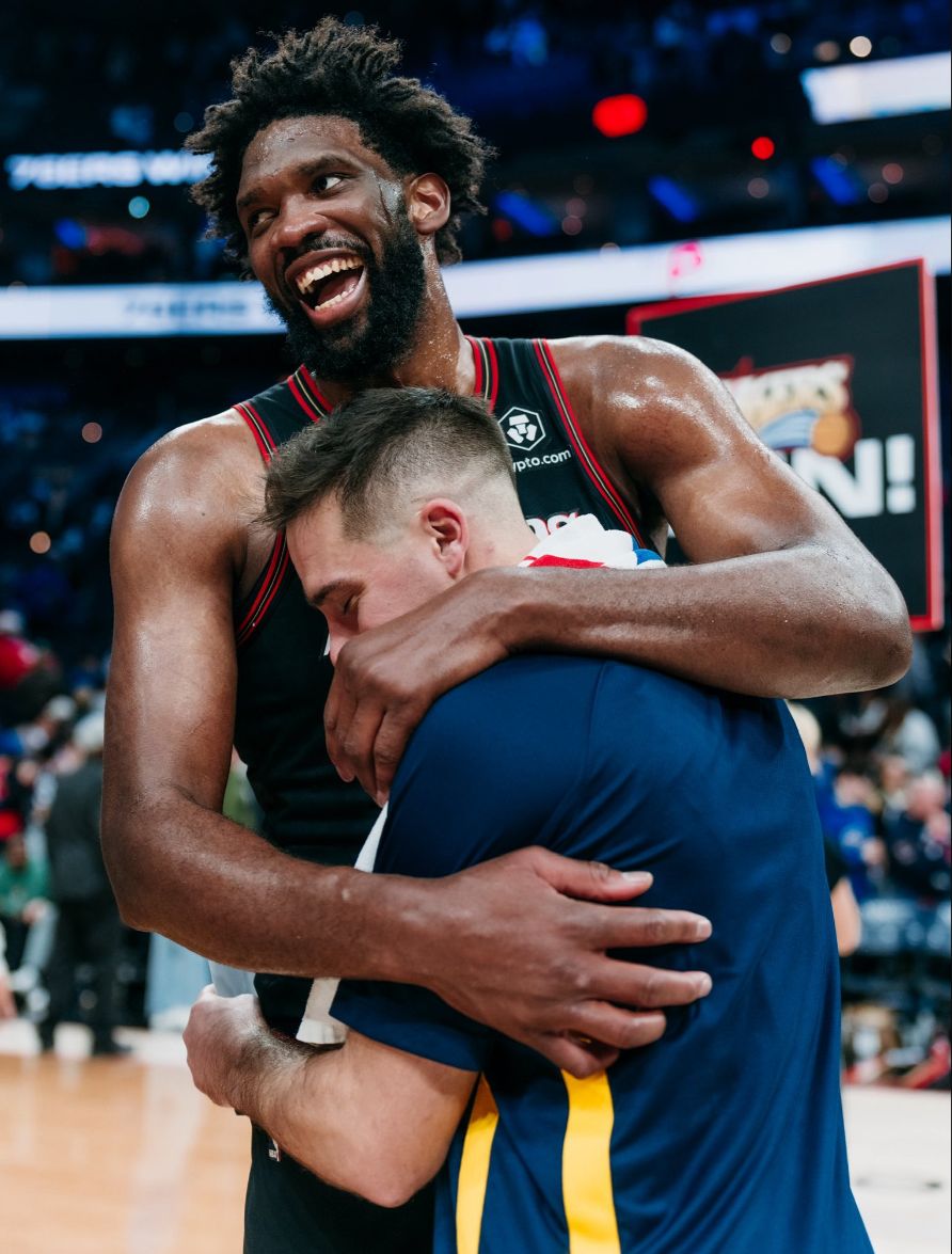 赛后恩比德与老队友麦克康奈尔紧紧相拥,这两人依旧保持了不错的友谊。