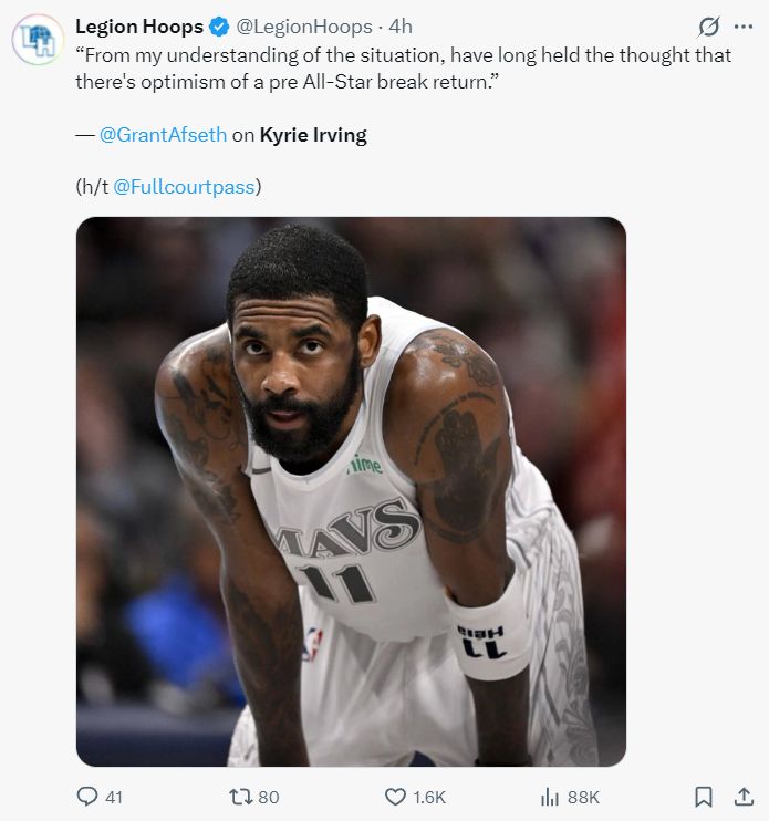 赛后独行侠队记Grant Afseth透露,凯利-欧文有希望在一个月或一个半月后复出,独行侠内部对他在全明星赛后复出持乐观态度,欧文本人也想证明自己伤愈后依旧是顶级球员,他甚至渴望挑战极限,比如比预期更早的回归赛场,欧文一直在全力以赴提前复出。