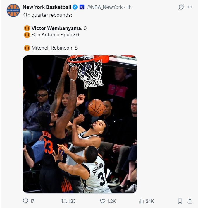 很多的记者都觉得能理解文班亚马的心情,甚至有记者觉得文班亚马带着如此的悲痛能打出这样的表现已经很不错了。但这场比赛的表现对比VS雷霆时差距非常之大,不管是攻防两端都不是一个级别。