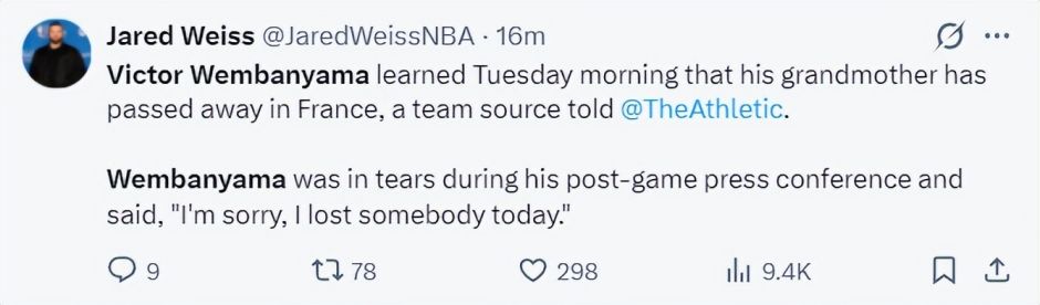 杰德-韦斯报道:在周二早上文班亚马得知自己的祖母去世了,在新闻发布会现场文班亚马的情绪激动。