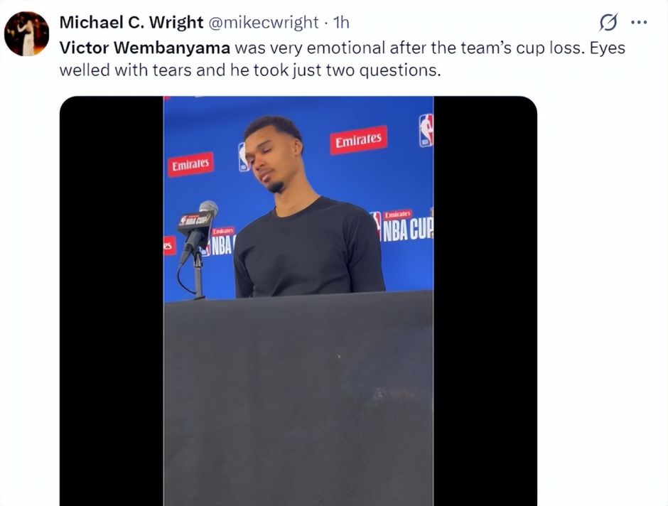 赛后文班亚马在新闻发布会现场的痛哭流涕,他说道:今天我失去了一个亲人。随后文班亚马沉默了,他一直在流泪,文班的鼻子都哭红了。