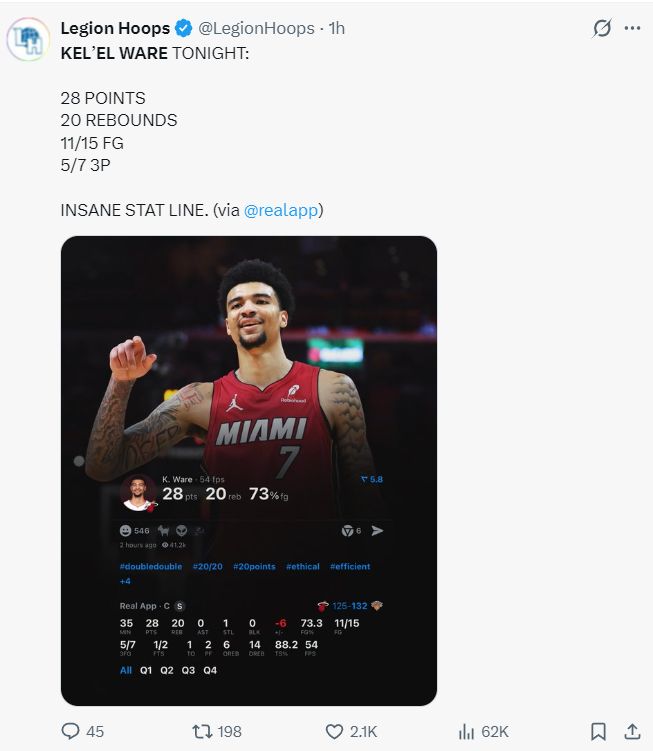 虽然热火此役输球,但他们的先发中锋韦尔发挥很出色,全场比赛34分30秒,15中11,三分7中5,罚球2中1,拿到28分19篮板1抢断,命中率73.3%,三分命中率71.4%,真实命中率高达88.2%。