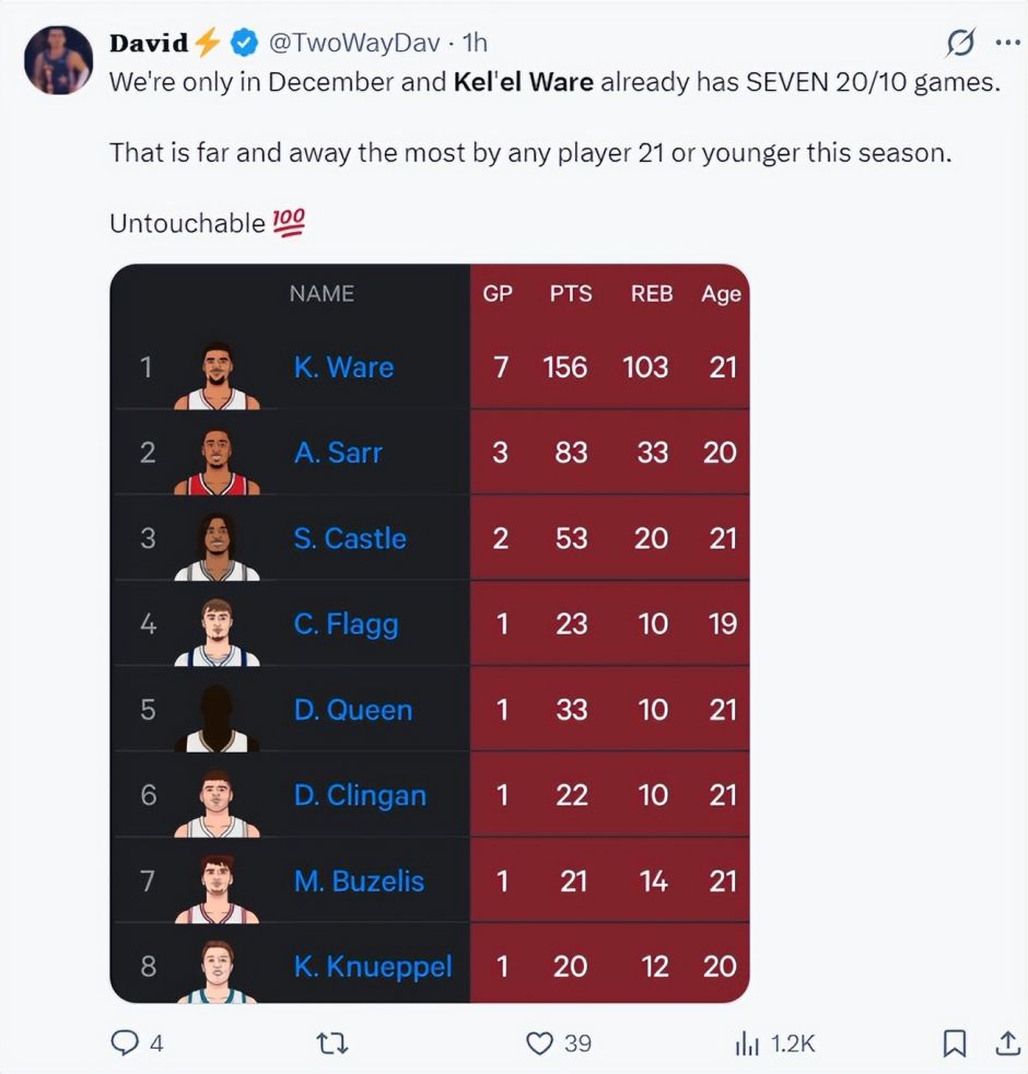 3.韦尔本赛季第七次拿到20+10是联盟21岁球员中最多;